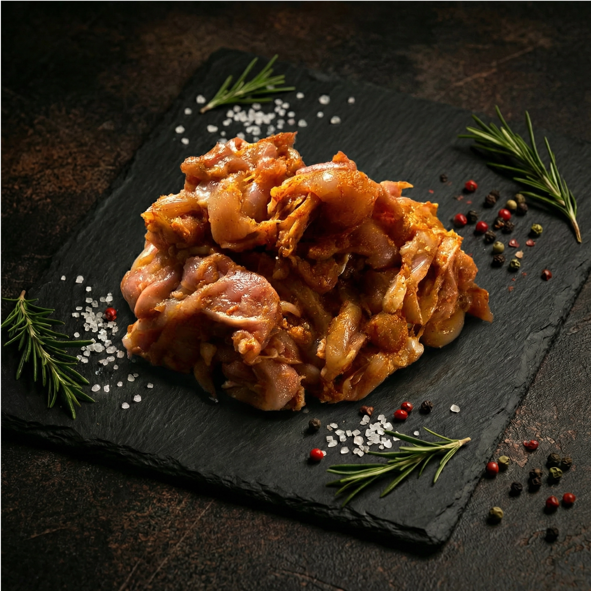 Deze kipshoarma is gemaakt van sappig kipdijvlees, in dunne reepjes gesneden en rijkelijk gekruid met onze huisgemaakte shoarmakruidenmix. Kipdijtjes zijn van nature malser en smaakvoller dan filet, waardoor deze shoarma extra sappig en vol van smaak is. Serveer het in een pita of flatbread met knoflooksaus en verse groenten, of combineer met rijst, friet of salade — het kan allemaal.