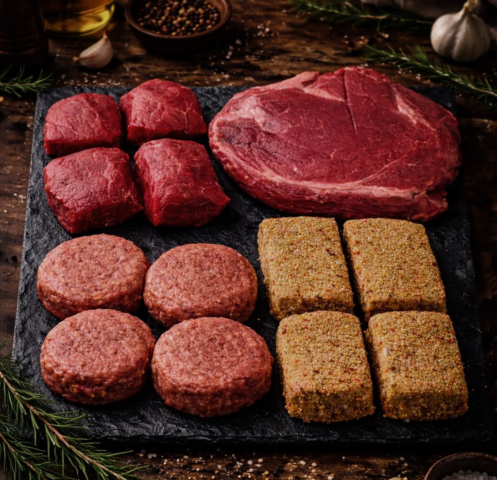 De Weekendbox Deluxe is een gevarieerde selectie rundvlees en ambachtelijke specialiteiten.